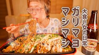 【深夜の背徳】お疲れ、ざつざつガリマヨ焼きそば。年度末なので、スタミナで乗り越えないとね。皆さんもお疲れ様です。【大食い女の日常】【大食い】【VLOG】