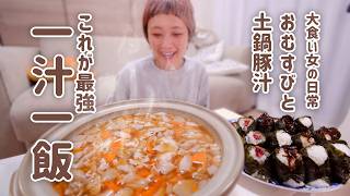 【大食い女の日常】最強の一汁一飯。土鍋で作る熱々豚汁と、梅おむすび・昆布おむすびで完全回復&リセット完了する今夜の大食い女。【大食い】【VLOG】